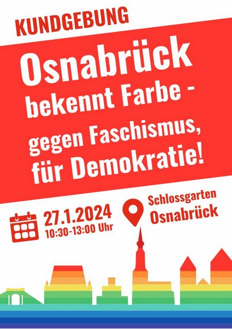 Die Evangelische Kirche im Sprengel Osnabrück, der Evangelisch-lutherische Kirchenkreis Osnabrück und die Diakonie Osnabrück Stadt und Land rufen ihre Mitarbeitenden und Gemeindeglieder dazu auf, sich an der Kundgebung und den weiteren Demonstrationen am 27. Januar um 10.30 Uhr im Schlossgarten in Osnabrück zu beteiligen.