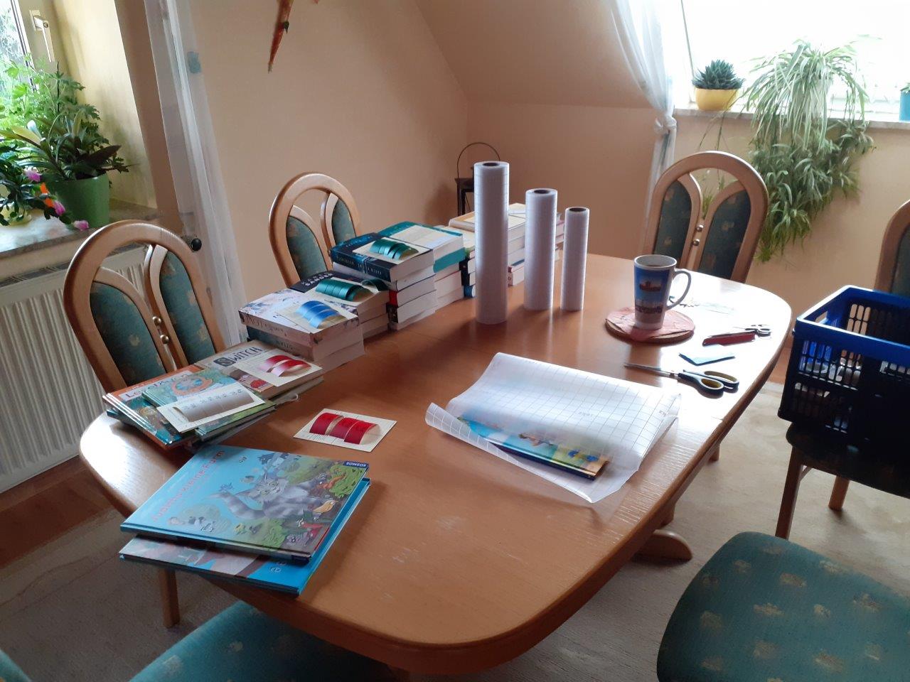 44 Bücher haben jetzt ein neues zu Hause oder sagen wir besser: in Kürze. Derzeit liegen sie ja noch auf meinem Esszimmertisch und warten darauf, eingearbeitet zu werden.
