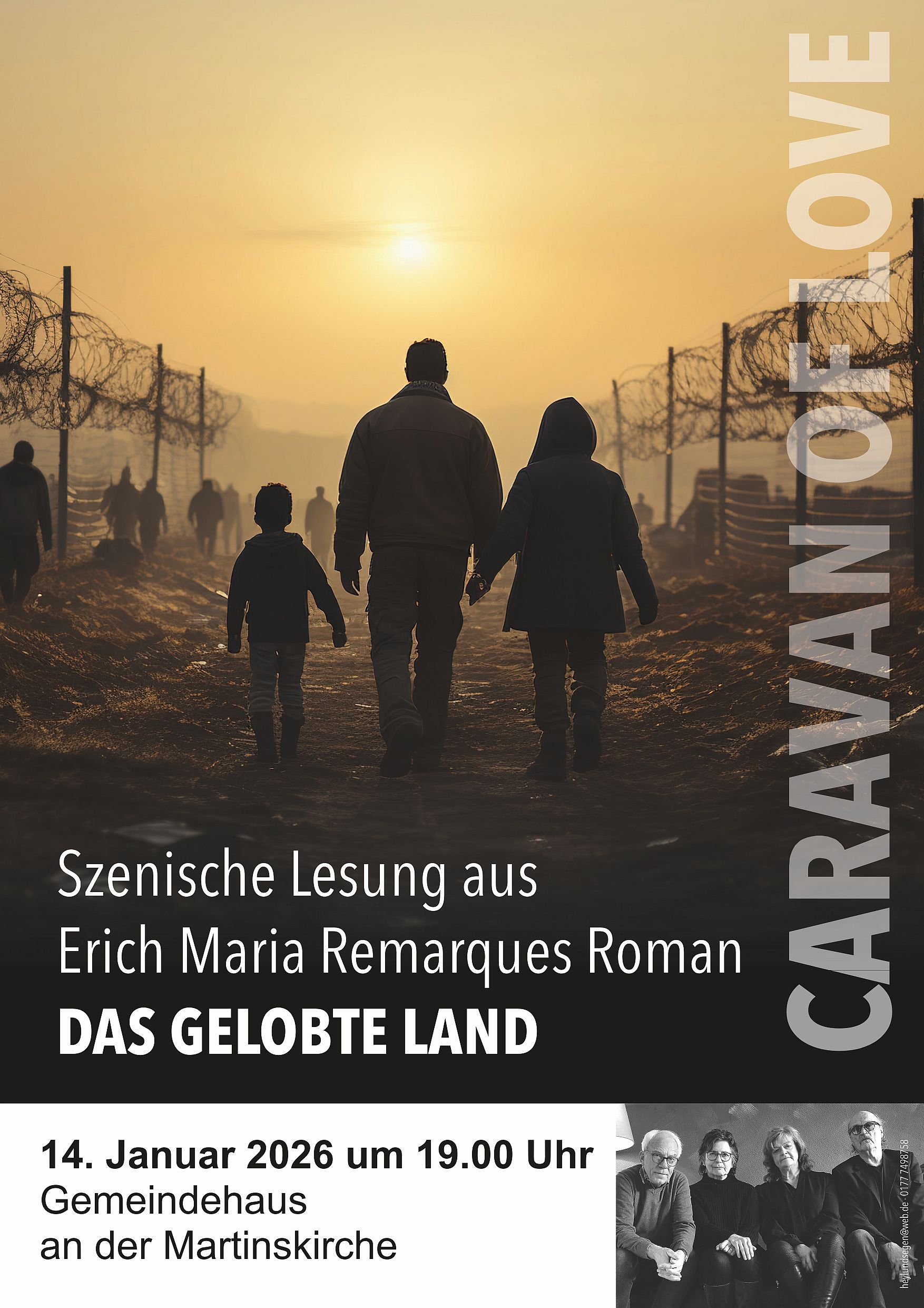 „Every woman, every man join the caravan of love! Stand up! Stand up!“ – So startet die szenische Lesung aus Erich Maria Remarques Roman „Das gelobte Land“. Nach den Romanen „Im Westen nichts Neues“ und „Der schwarze Obelisk“ sowie der Beziehung zu Marlene Dietrich widmet sich das Ensemble Heyl&Segen mit Ulrike Pepmöller, Sonja Schwarz, Hartmut Heyl und Rolf Westheider mit seiner neuen Produktion „Caravan of Love“, dem letzten, unvollendet gebliebenen Werk von Erich Maria Remarque „Das gelobte Land„ – musikalisch und szenisch gestaltet.